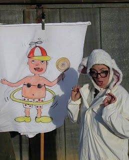 Above is pictured the “Where Are We Going” Cantastoria from the Old Reliable Horsedrawn Spectacular and a cranky from the Boxcutter Cabaret being performed in Philadelphia. Below is a picture of Lindsay performing her robot cantastoria as the Professor D. Wabbit.