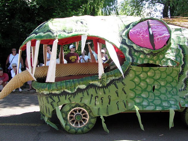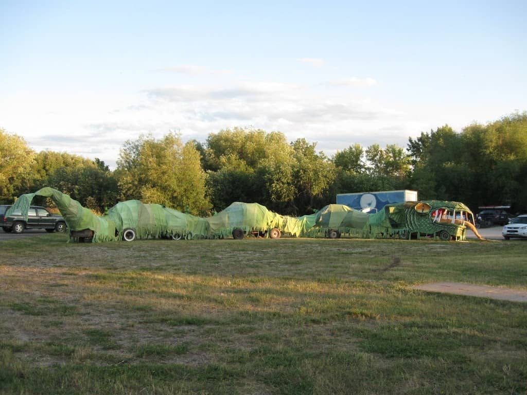 115 foot long Sea Monster from the 2009 4th of July Parade, Madeline Island, WI. Built as part of the Live Art 2009 workshop. It was lovingly built by many hands under the direction of Adam, Lindsay and Tom Nelson.
