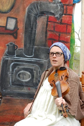 “Cardboard Radio,” Gays Mills Folk Festival, 2008, Gays Mills WI. (Backdrop painted by Adam – part of his “Woodstoves I Have Loved” collection.)