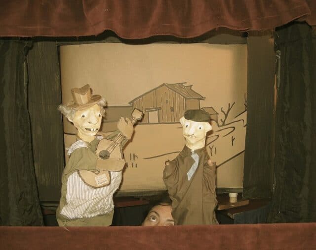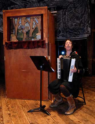 Woodchopper Opera, Boxcutter Cabaret, Spring 2008, North Hampton MA – Adam is behind the stage, waggling the dollies. (Photograph by Robert Tobey)